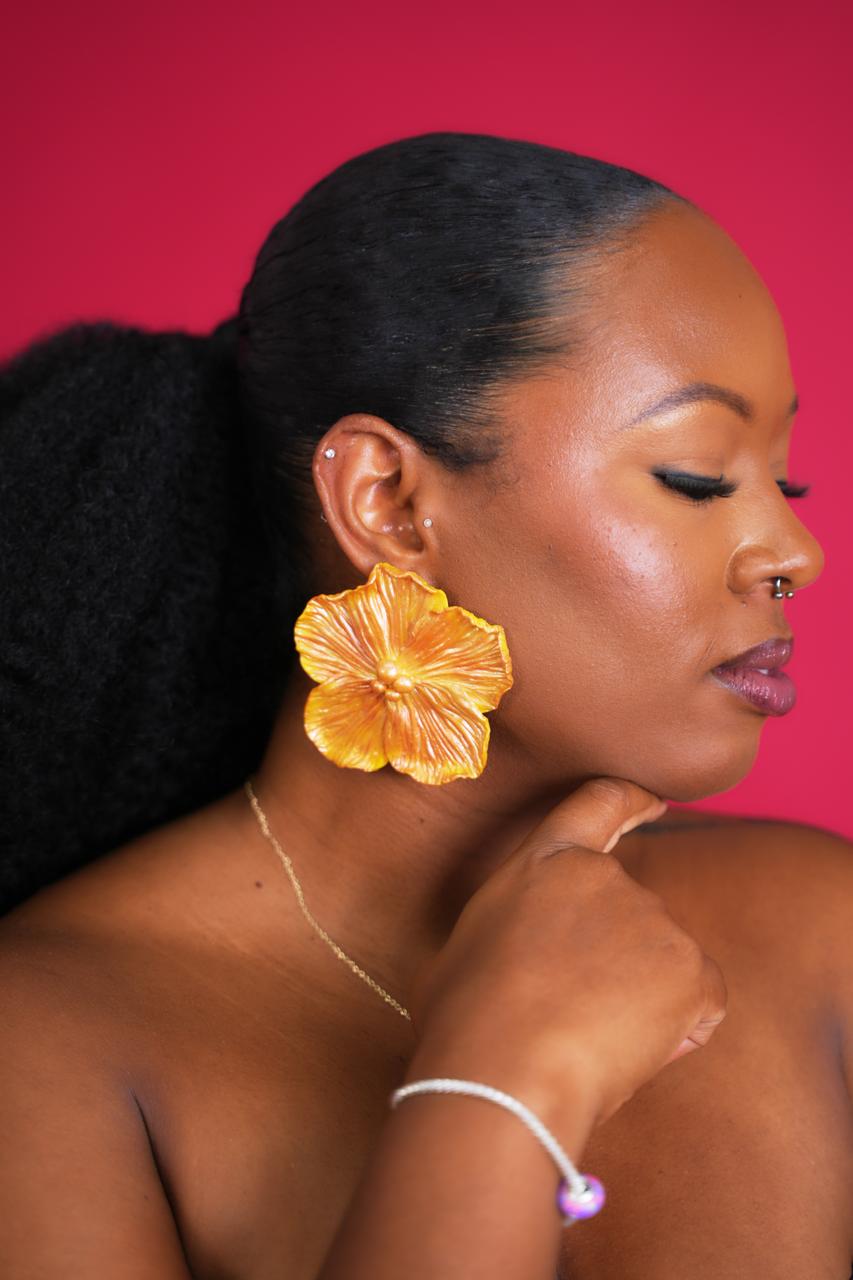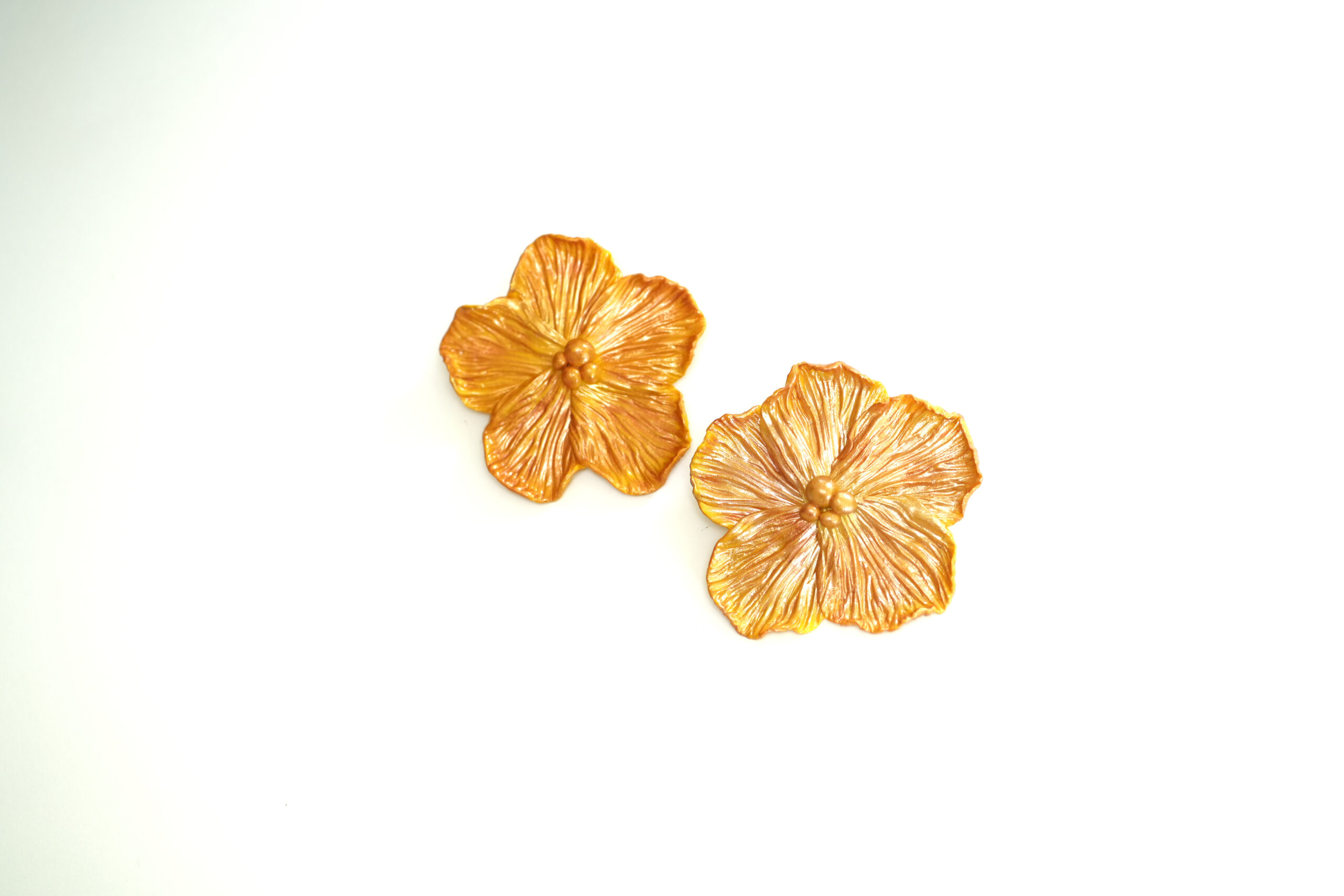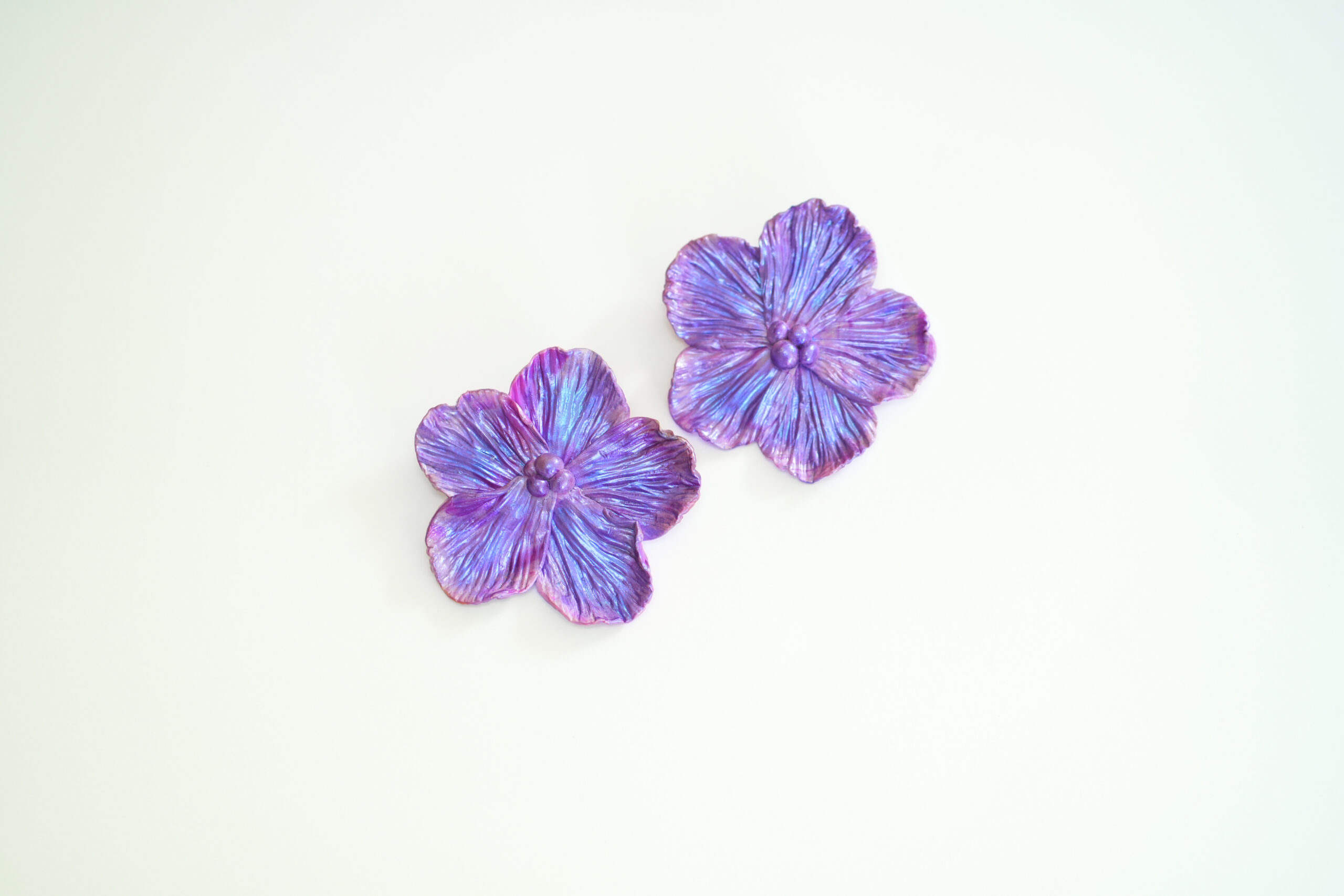 Introducing Bloom!These captivating floral earrings boast an iridescent purple, green and gold finish, catching the light with every movement. Their bold yet elegant design makes a sophisticated statement, perfect for adding a touch of enchanting color to any ensemble.