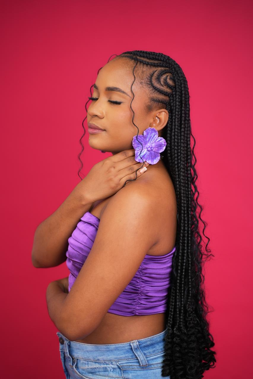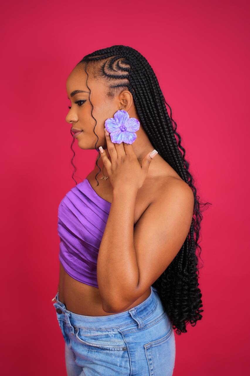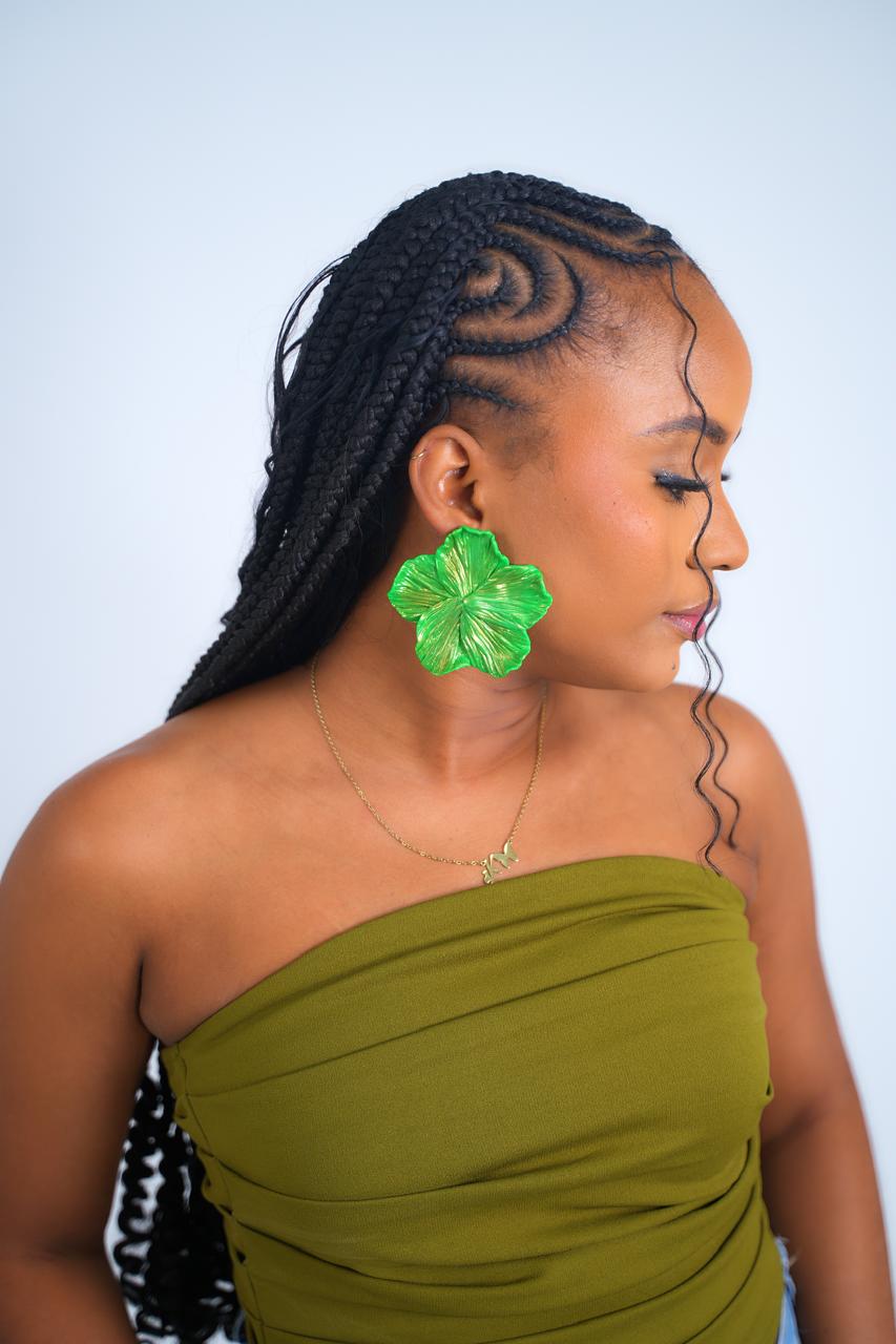 Introducing Bloom!These captivating floral earrings boast an iridescent purple, green and gold finish, catching the light with every movement. Their bold yet elegant design makes a sophisticated statement, perfect for adding a touch of enchanting color to any ensemble.