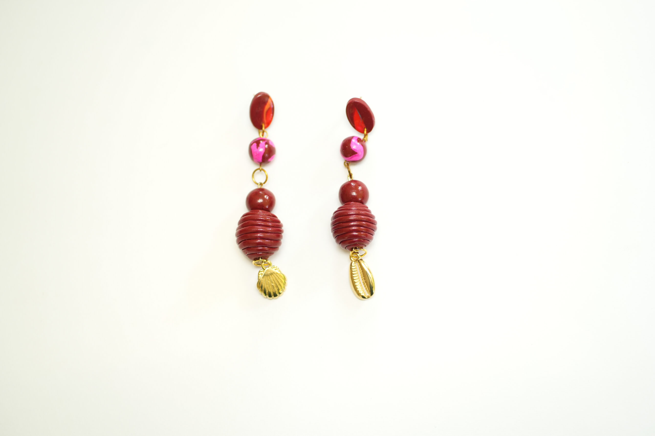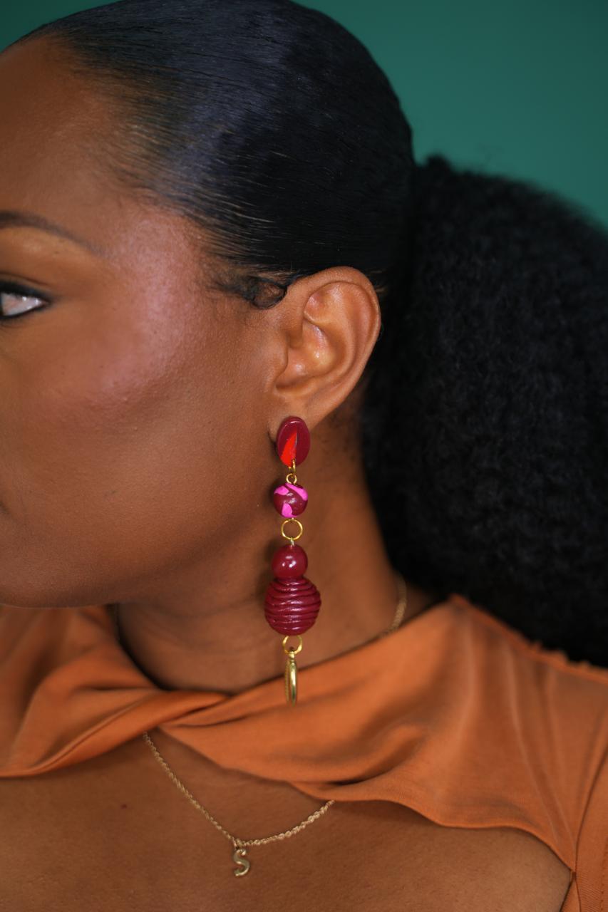 Introducing Kaleid!  This stunning dangle design features a captivating sequence of burgundy and fuchsia-toned beads, each with its own unique texture and pattern. The centerpiece is a beautifully ribbed, deep burgundy bead, adding a touch of artisanal detail and depth. Finished with a delicate gold accent, the Kaleid earrings are a bold yet elegant statement piece, perfect for adding a luxurious pop of color and dynamic movement to any look.