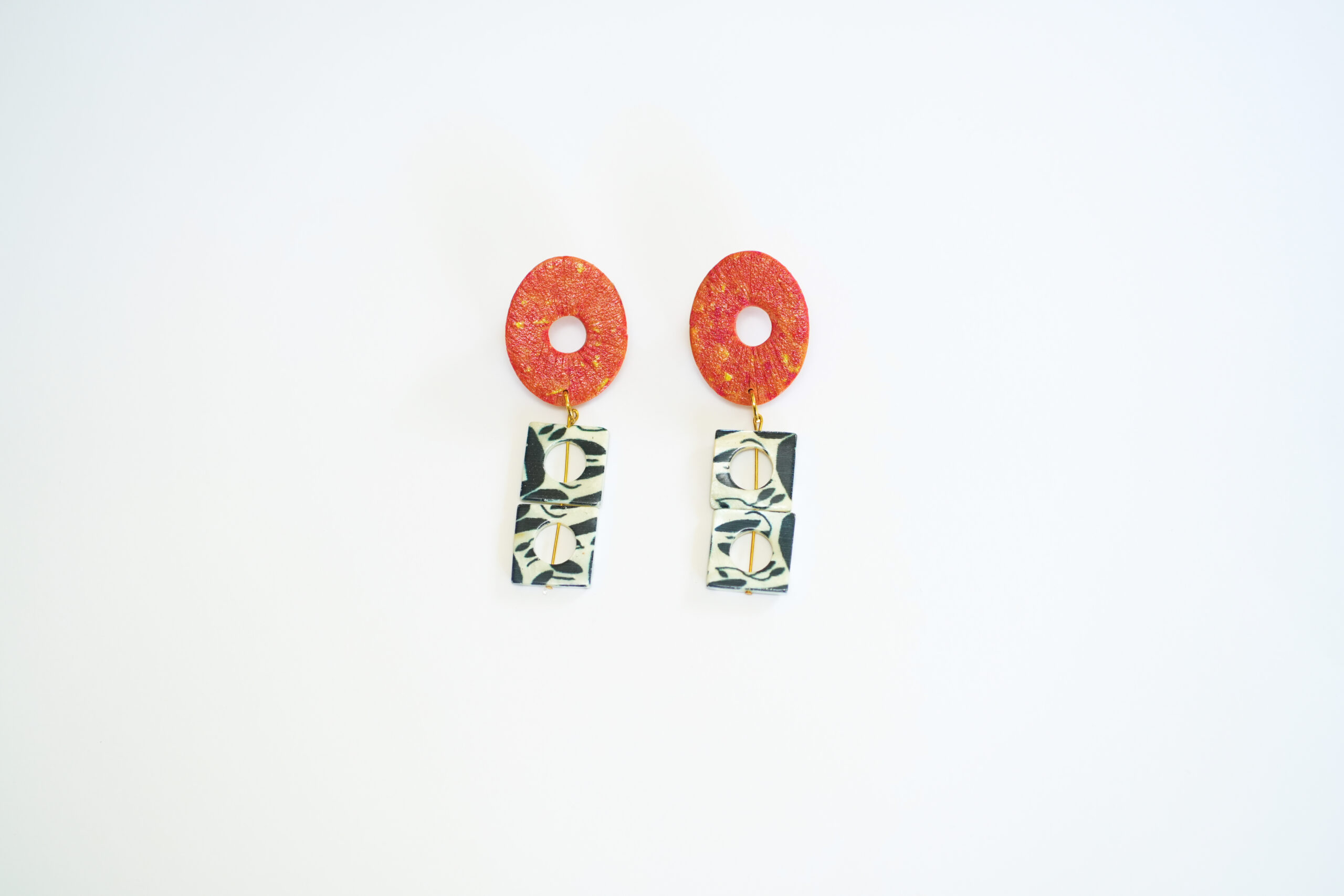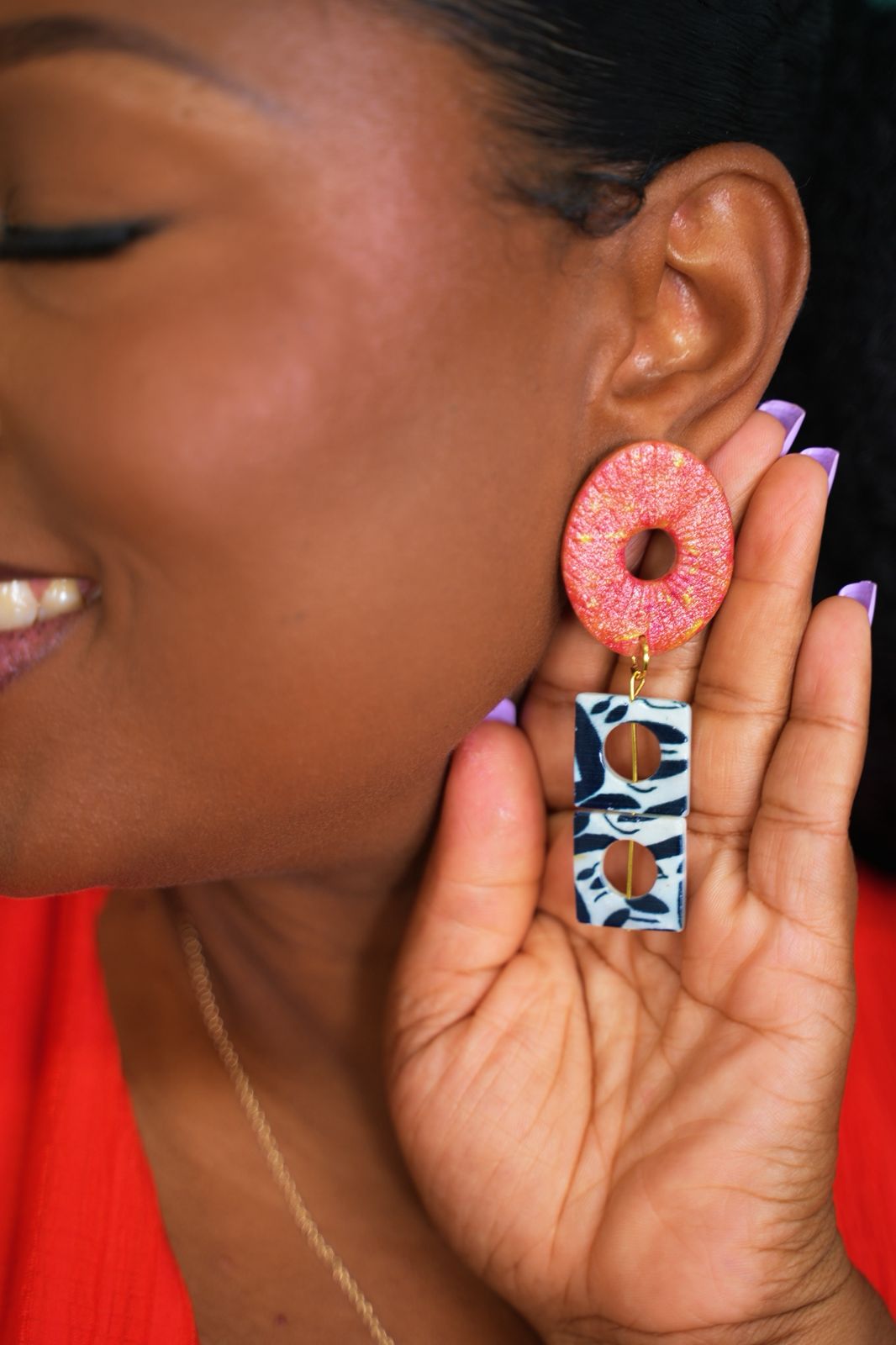 Introducing Nova!  The Nova earrings, a captivating fusion of vibrant color and modern design. These striking dangle earrings feature a shimmering, textured coral-pink circular stud with a central cutout, radiating a playful and energetic vibe. Below, a sleek rectangular drop showcases a mesmerizing, ink-like black-and-white pattern that offers a cool, abstract contrast. The Nova earrings are a true statement piece, perfect for those who dare to mix bold textures and patterns to create a uniquely expressive look.