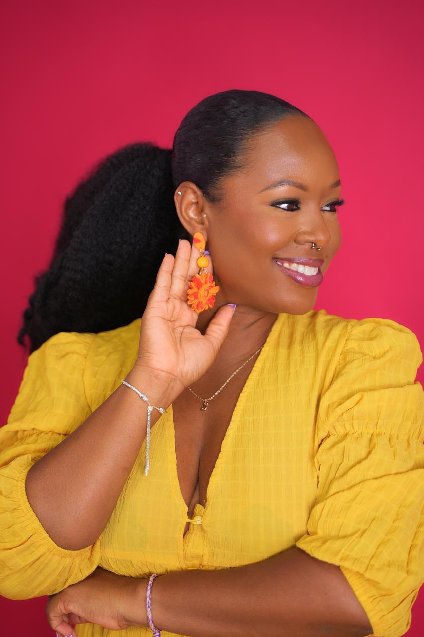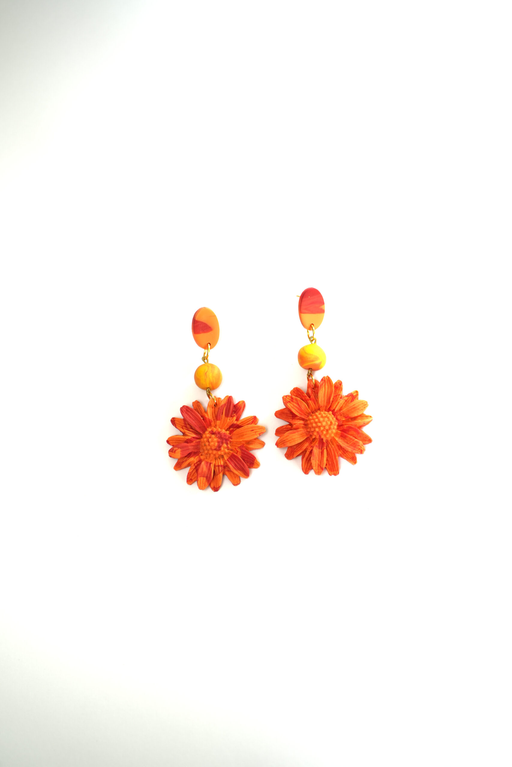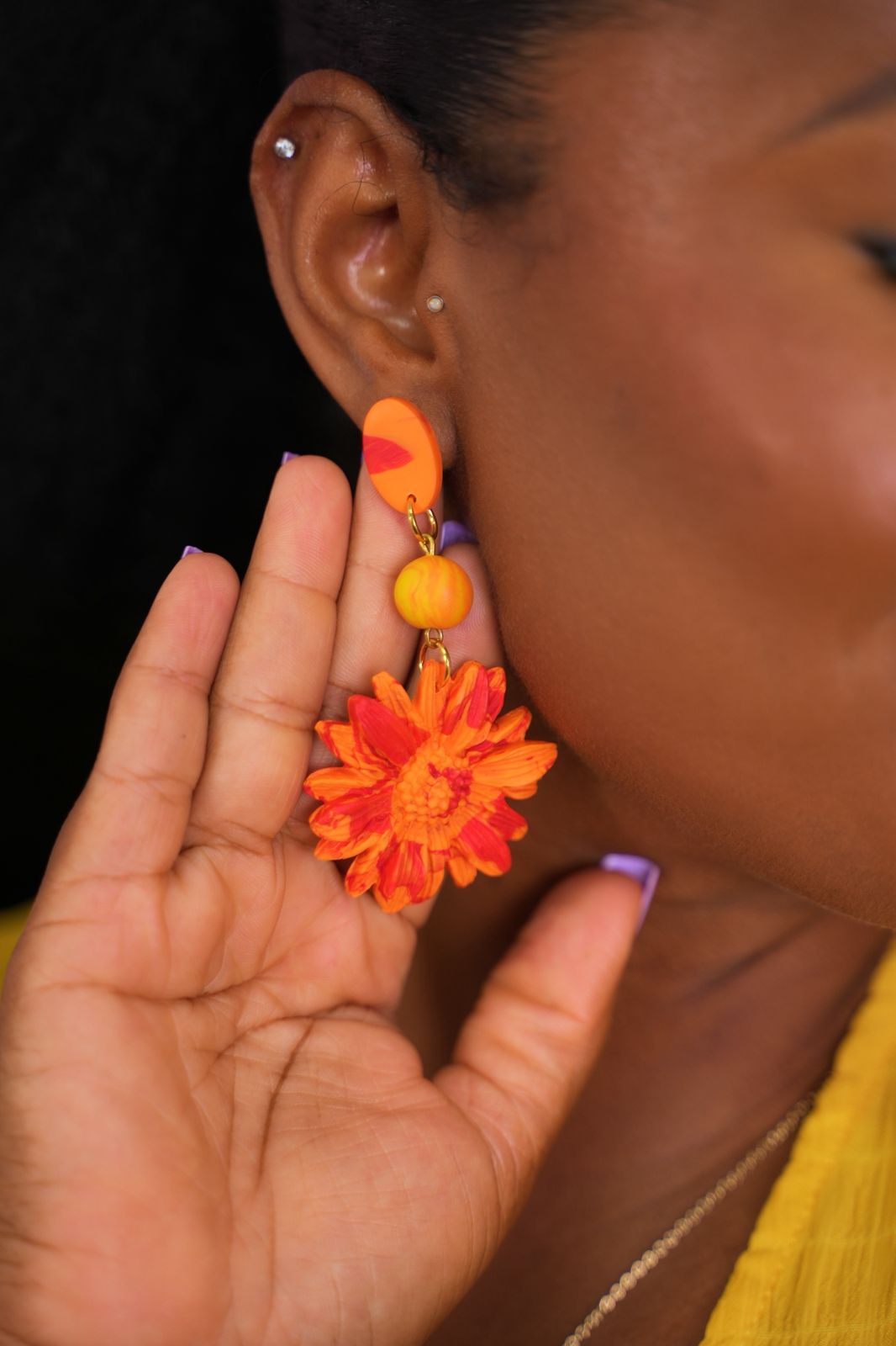 Introducing Nyah! These stunning dangle earrings feature an intricate, fiery orange floral design that radiates warmth and joy. Accented with a playful orange and yellow bead, Nyah is a celebration of color and detail, perfect for bringing a sunny disposition to your look.